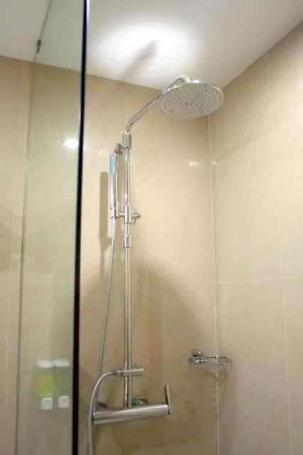 こちらのバスルームはシャワータイプ。大き目のシャワーヘッドで気持ちよく浴びられそう。とてもシンプルなつくりです。