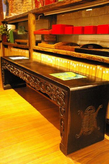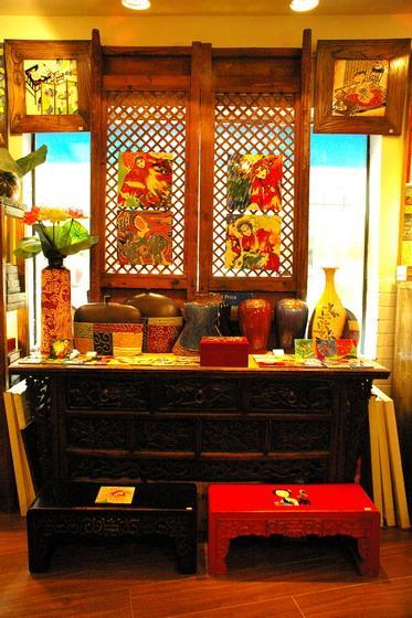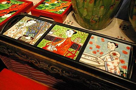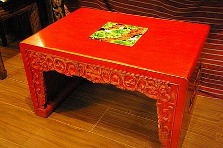 中国古代家具のテイストをアレンジした、ステキなテーブルも見つけました。奥の茶色いリビングボードは、写真では他の商品に隠れてちょっと見えませんが、左右2ヶ所に陶板画がはめ込まれています (3,800元)。手前の赤いテーブルは金魚と蓮の絵柄付きです (2,000元)。