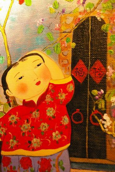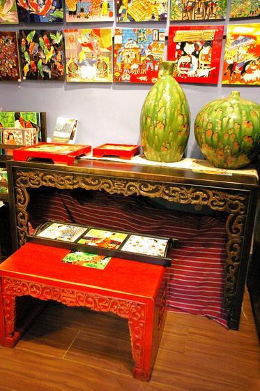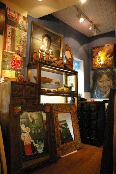 店内奥の一角には絵画もありました。ホンワカ温かみのあるタッチで描かれた子供の絵 (写真右) は男の子と女の子のそれぞれ独立した絵でちょうど対になるんだそうです。形も縦長の長方形なので、2枚並べるとバランスよく飾れそう(1枚1,900元)。