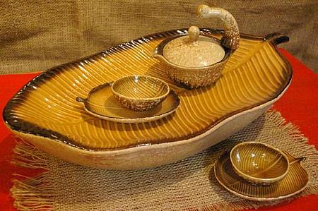 圧倒的に陶板画で埋め尽くされたお店ではあるんですが、よく見ると中国茶器のセットもほんの少しディスプレイされています。中でも個性的なのがコチラ! 大きな葉っぱの形をした茶盤 (下部に湯や茶が流れ込むようになっています) に、茶壷、茶器6セットの合計8点で750元というお値打ち価格。ただ、お持ち帰りには少々重たいかも…。