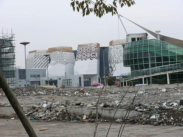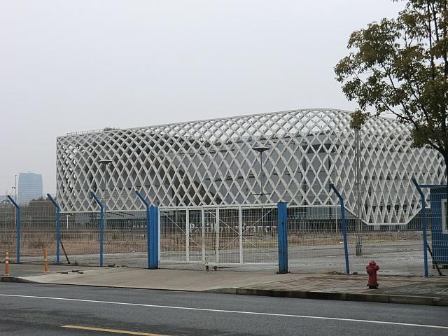 万博会場跡地には、まだまだ残ってるパビリオンがいっぱい。奥の白い建物はロシア館、右の緑の球体はルーマニア館です。